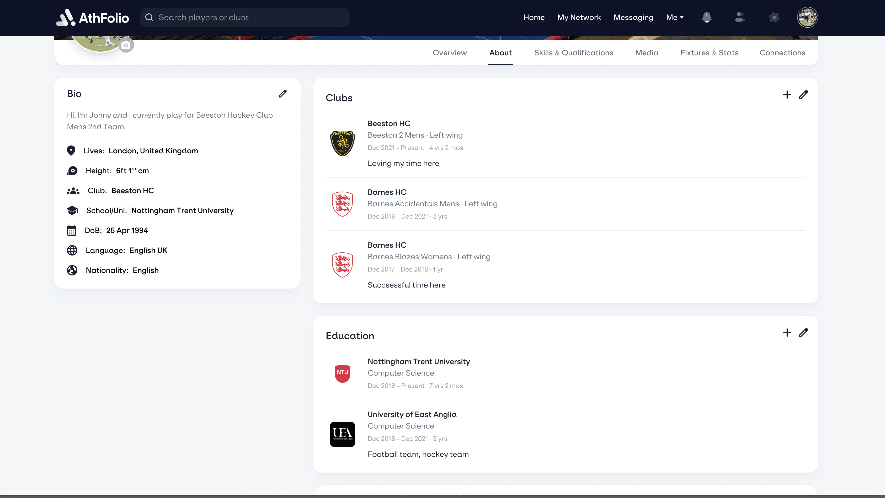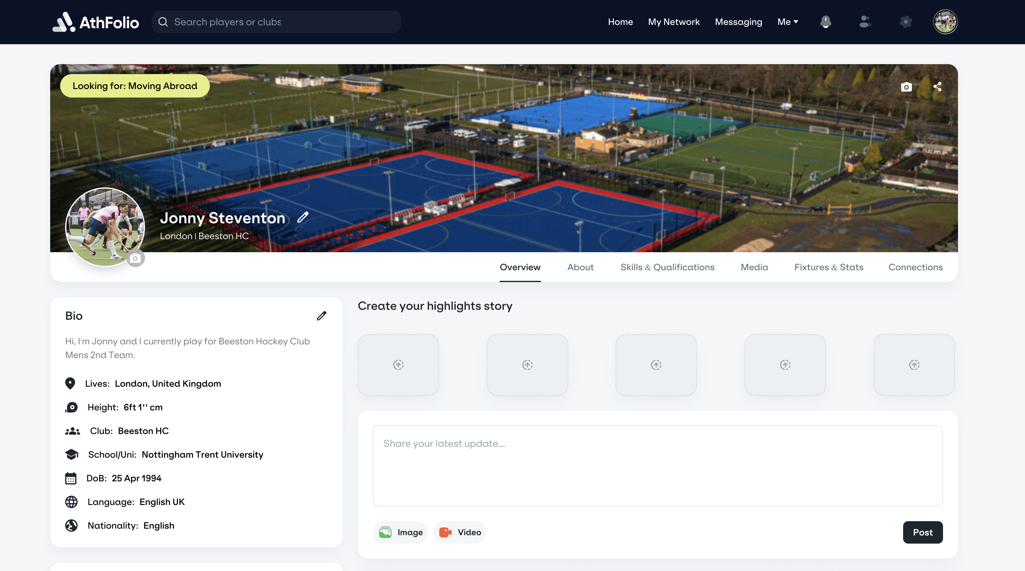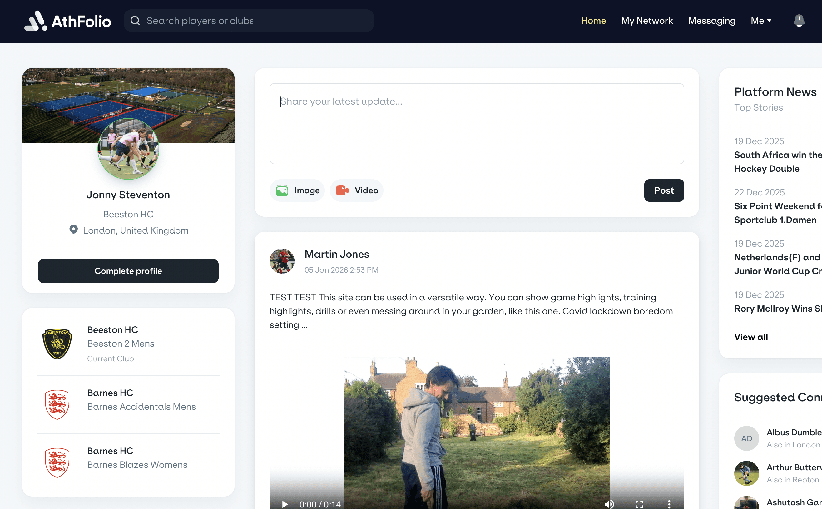 AthFolio is a sports-focused platform designed to give players and clubs a richer digital presence, combining profiles, performance data, social interaction, and team structures into a single system. The platform is currently midway through development, with core foundations in place and active delivery ongoing.