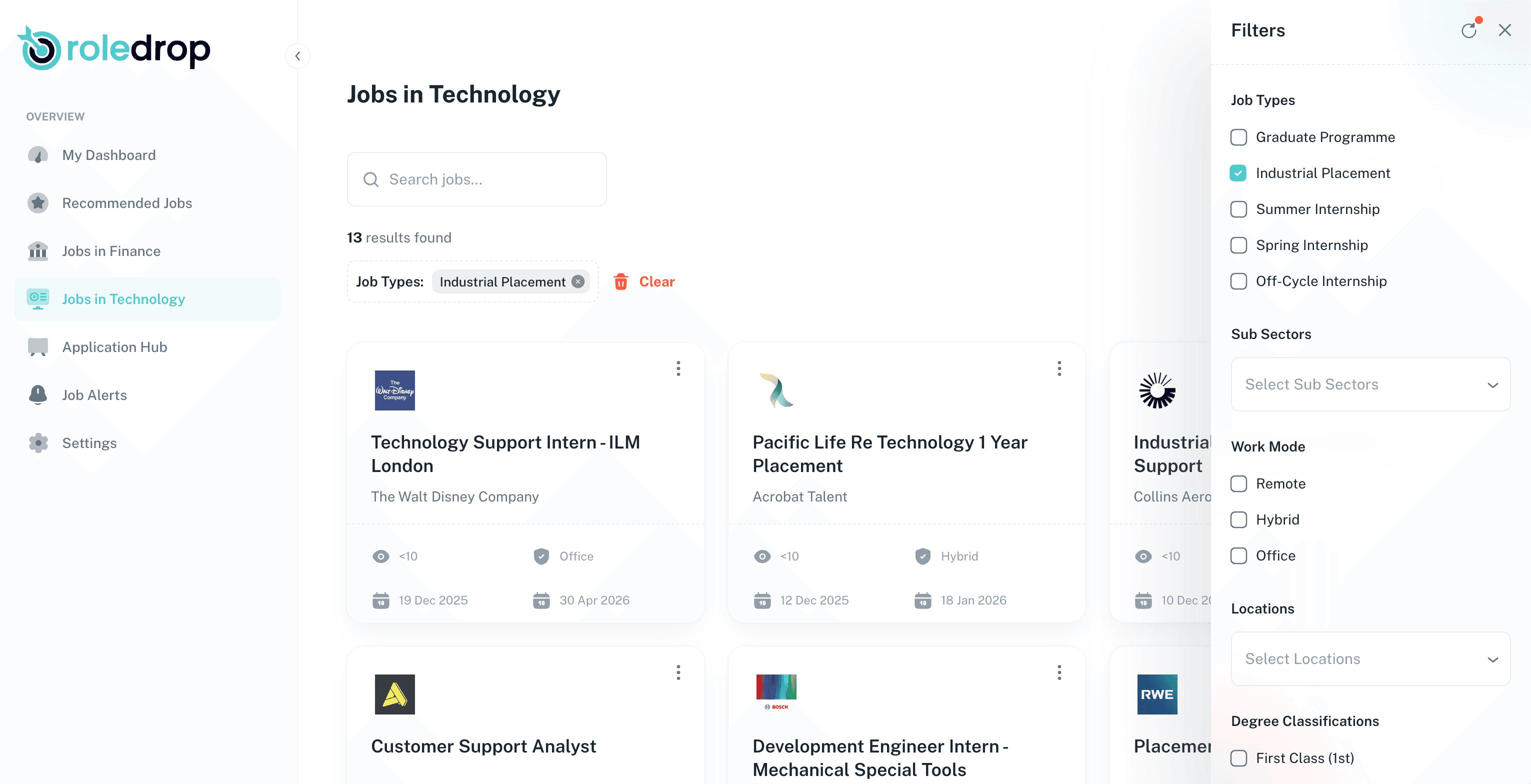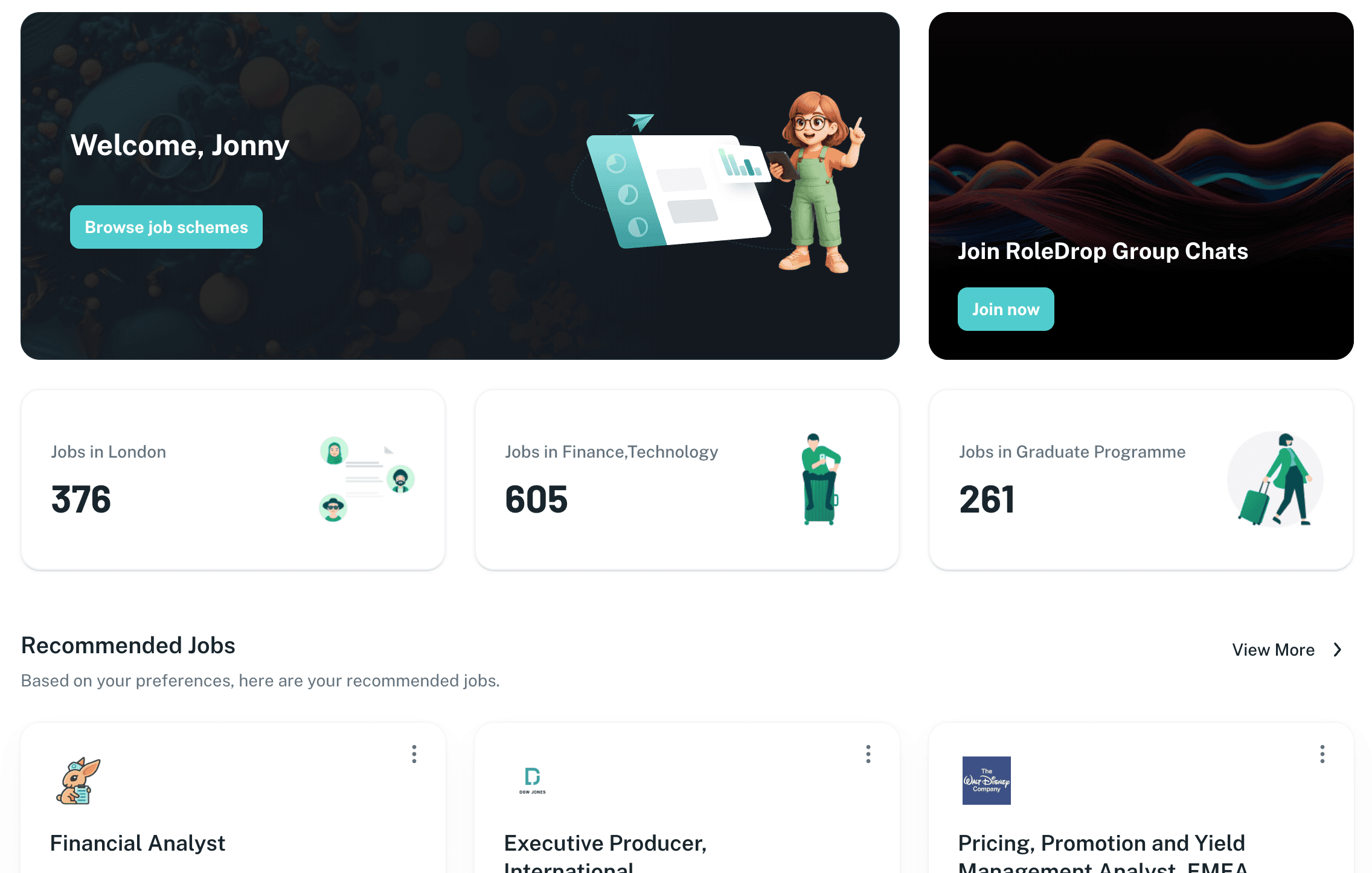 Role Drop is a web-based platform designed to help students and early-career graduates discover graduate schemes and internships in a clearer, more structured way. The product focuses on personalised job discovery and application tracking, solving a problem the client has seen repeatedly throughout graduate space.
